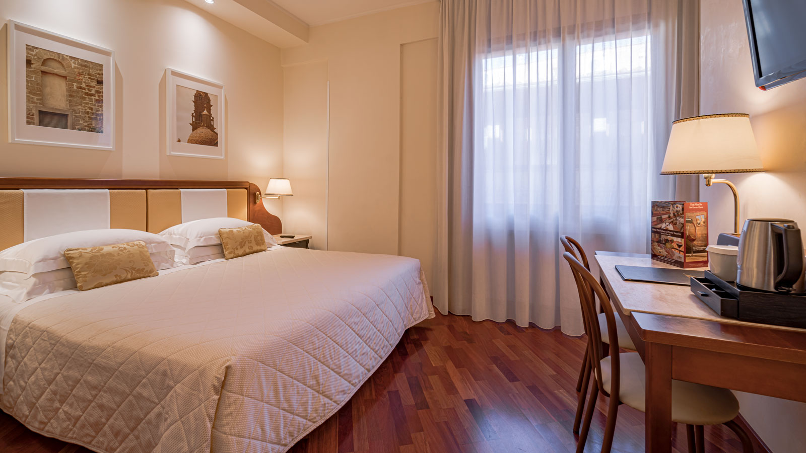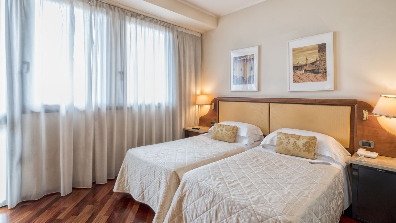 Nach einem erlebnisreichen Tag in der Stadt ist es am angenehmsten, ein gemütliches Zimmer zum Entspannen zu finden. Unsere klassischen Doppelbettzimmer wurden vor kurzem renoviert, um unseren Gästen das Beste zu bieten, mit warmen Farben, einem großen Schreibtisch, hell und schallisoliert. Ausgestattet mit den wichtigsten Annehmlichkeiten, wie zum Beispiel einen Flachbildfernseher mit digitalem terrestrischen Gerät, Wasserkocher für Tee und Kaffee und Telefon mit externer Leitung.
